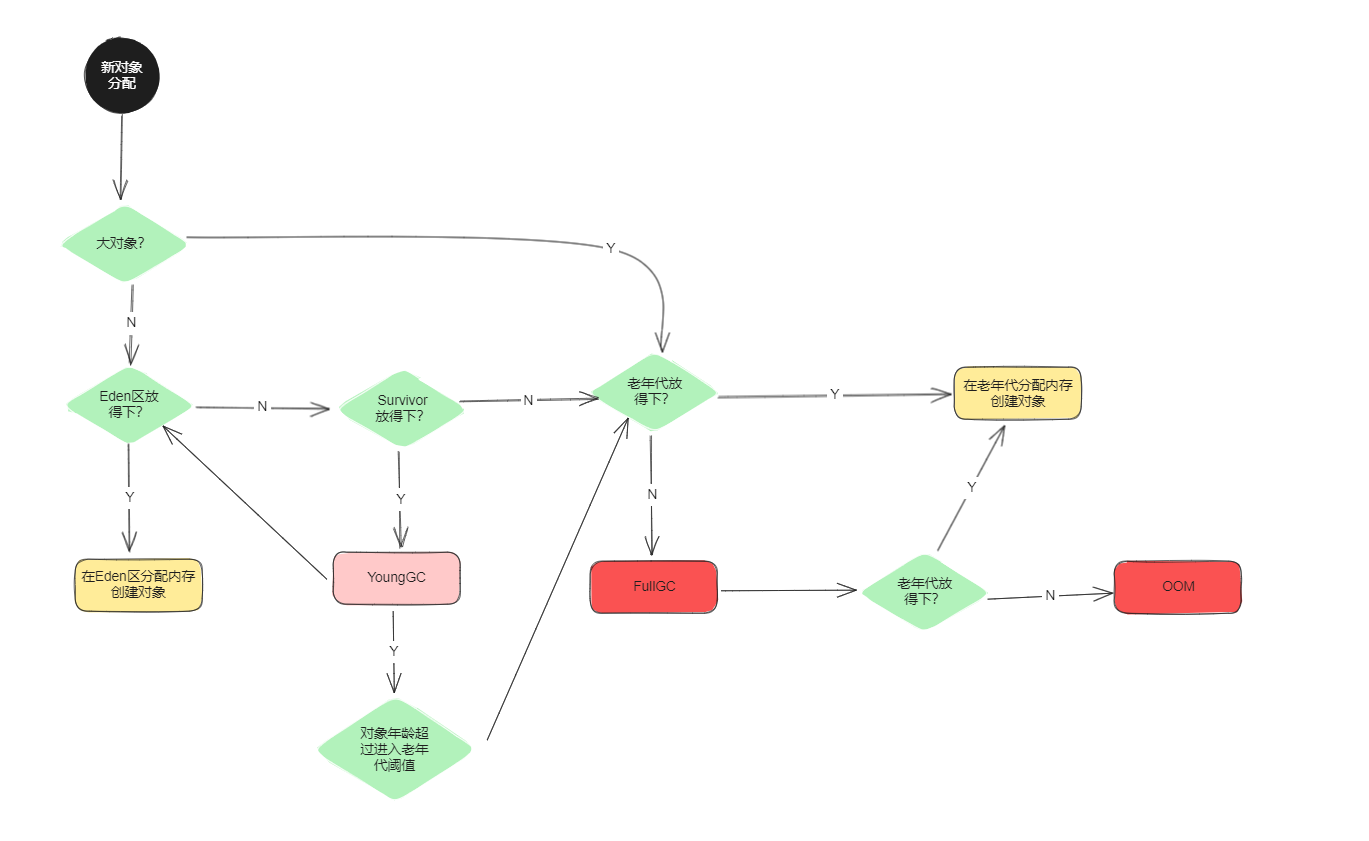 在年轻代创建对象,会发生在Eden区,但是这个时候有可能会因为Eden区内存不够,这时候就会尝试触发一次YoungGC。(会在YoungGC前做一次空间分配担保,如果失败可能直接触发FullGC)