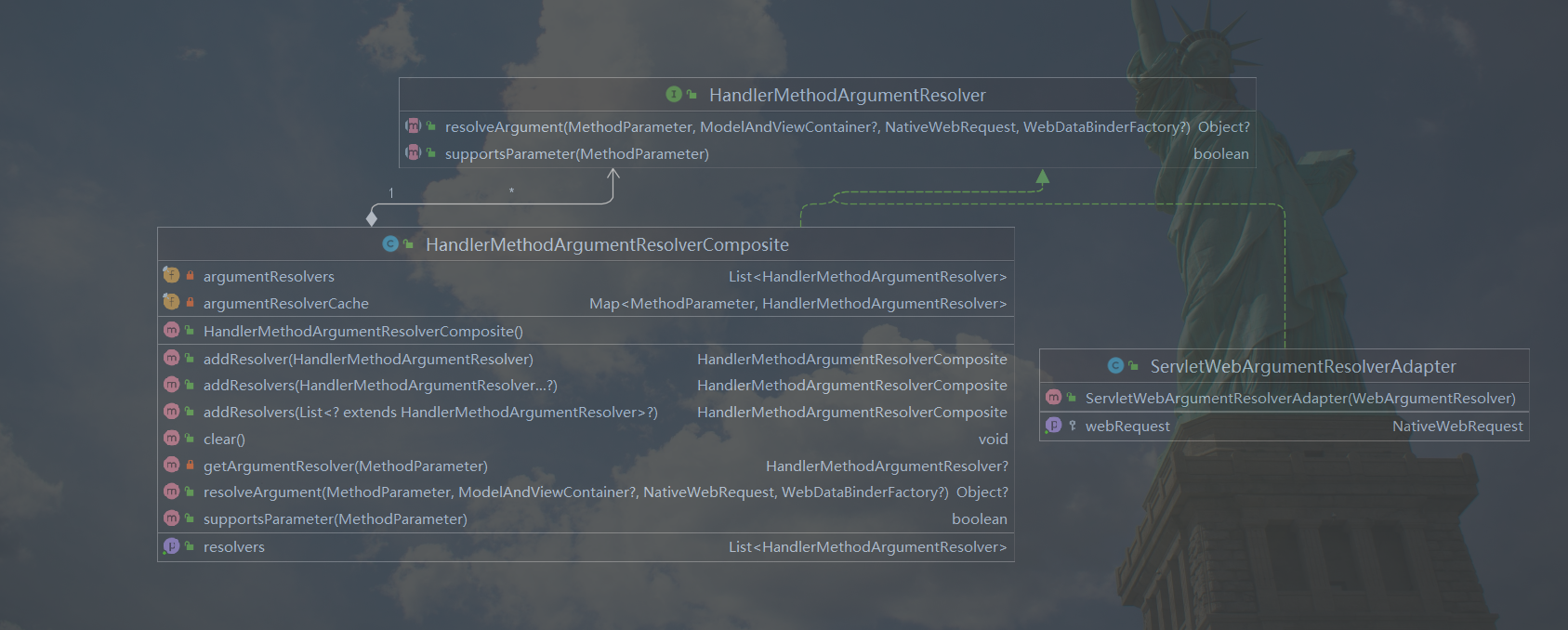 组合模式在SpringMVC中用的非常多,其中的参数解析,响应值处理等模块就是使用了组合模式。拿参数解析模块举例: