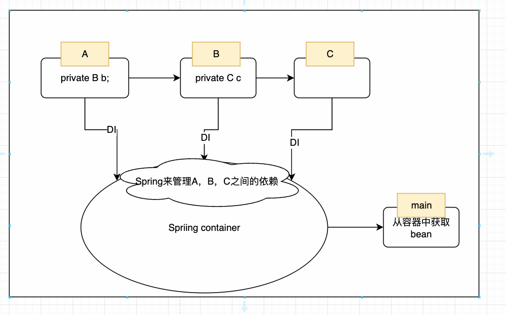 对于Spring的IOC来说,它是IOC思想的一种实现方式。在容器启动的时候,它会根据每个bean的要求,将bean注入到SpringContainer中。如果有其他bean需要使用,就直接从容器中获取即可,如下图所示: