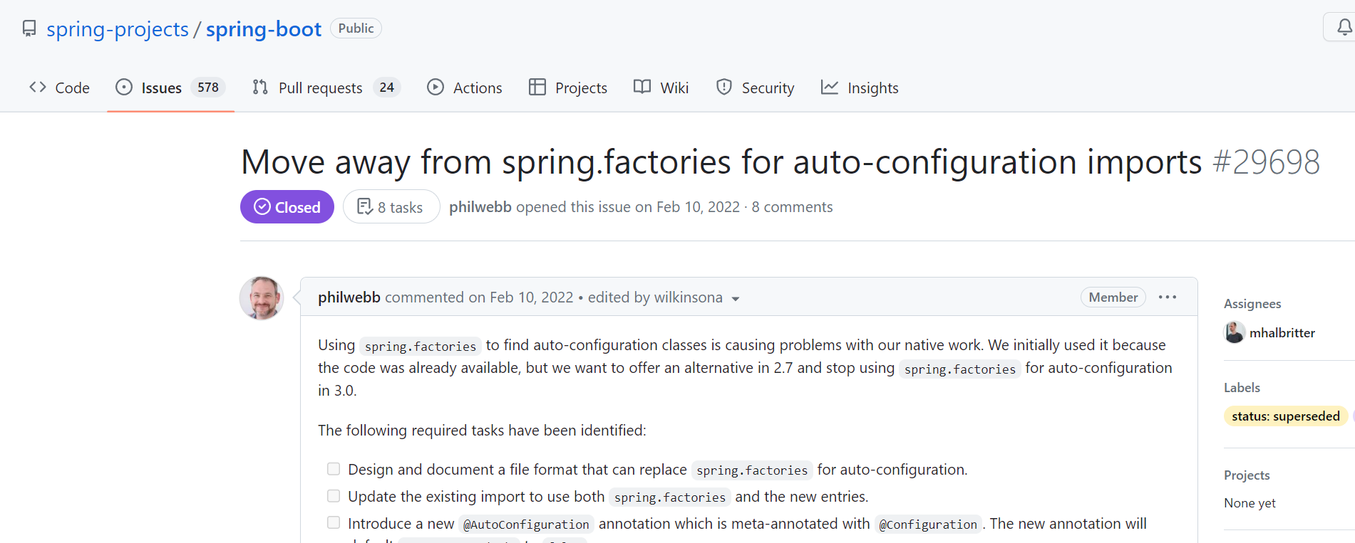 Using spring.factories to find auto-configuration classes is causing problems with our native work. We initially used it because the code was already available, but we want to offer an alternative in 2.7 and stop using spring.factories for auto-configuration in 3.0
