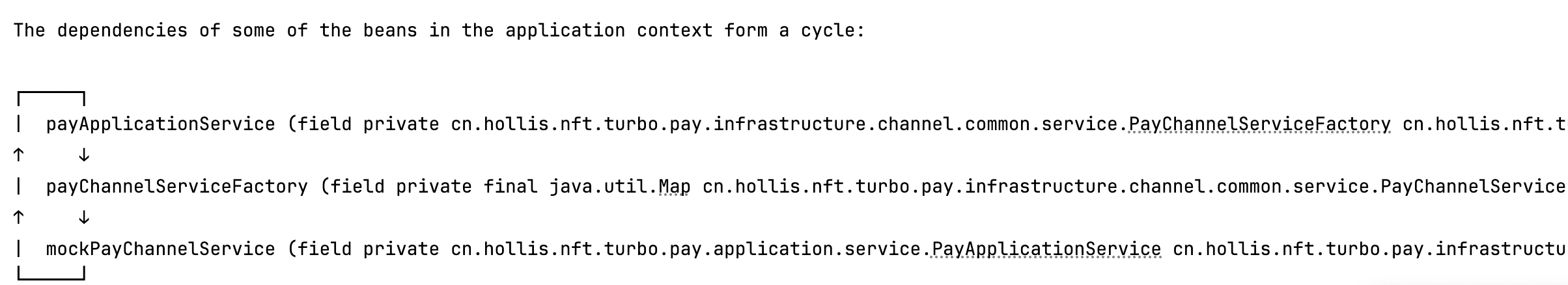 提示是有一个循环依赖的问题,即 PayApplicationService -> PayChannelServiceFactory -> MockPayChannelService -> PayApplicationService