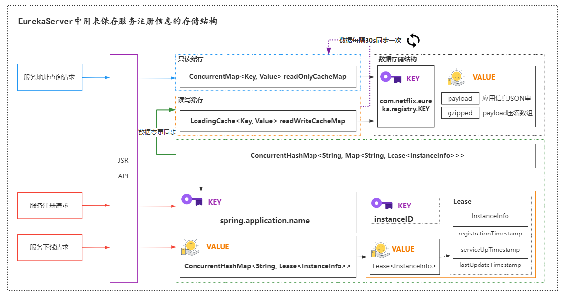 readOnlyCacheMap:readOnlyCacheMap 是对服务注册信息的一个只读视图,主要用于处理对服务实例信息的外部请求。这个缓存层定期从 readWriteCacheMap 更新数据,保证了信息的一定程度的新鲜度和准确性,同时因为是只读操作,可以提供非常高效的访问速度。