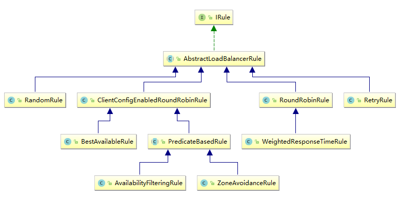 Ribbon的核心是负载均衡算法,它决定了如何选择服务实例。Ribbon提供了多种负载均衡算法,包括轮询、随机、加权随机、加权轮询、最少连接数等,他们的具体实现是实现了IRule接口,继承自AbstractLoadBalanceRule实现的: