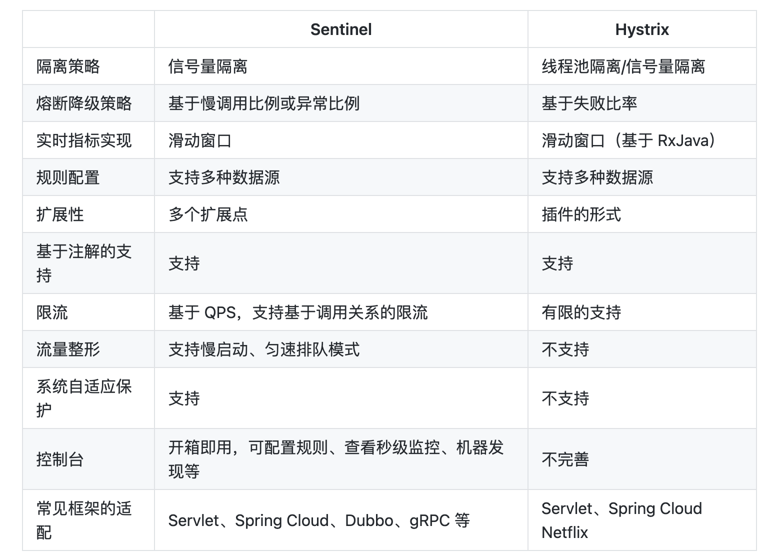 关于Hystrix和Sentinel的对比,在Sentinel的官网上有一篇文章写的挺详细的: https://sentinelguard.io/zh-cn/blog/sentinel-vs-hystrix.html
