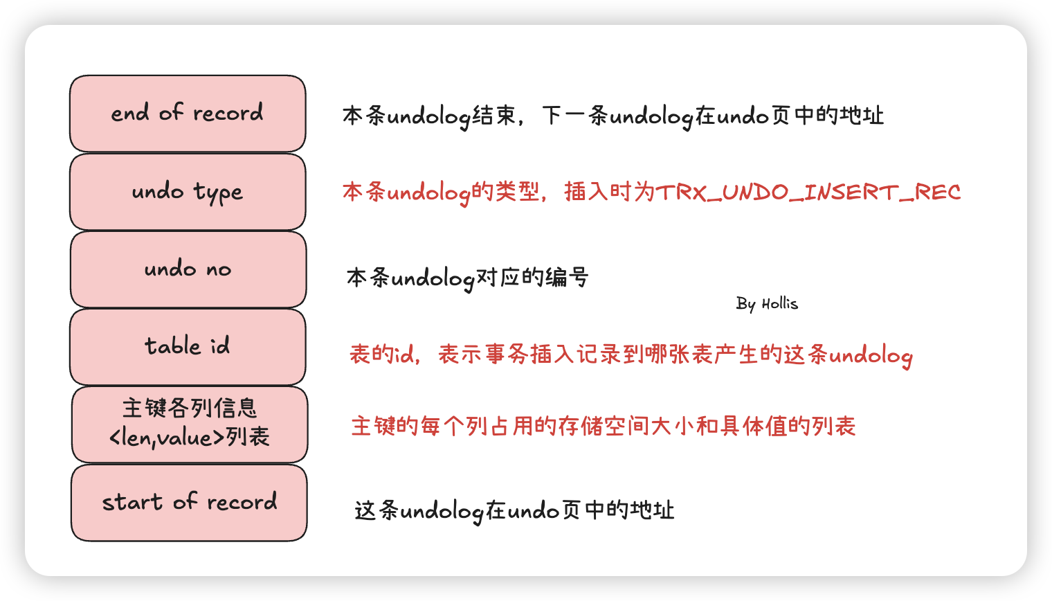 insert也是有可能会滚的,所以undolog肯定要记录,这样才能基于undolog做撤销insert操作。那么insert操作的undolog都要记录哪些信息呢?