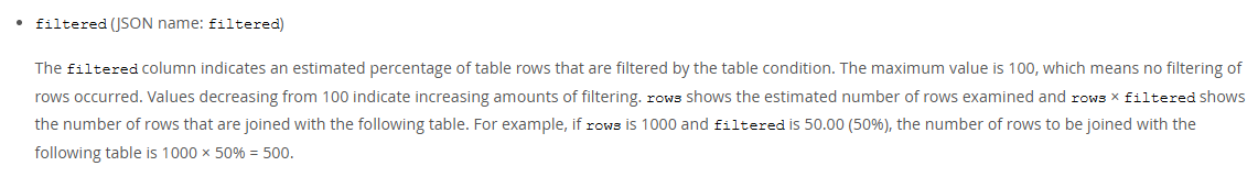 翻译一下:filtered 列表示通过表条件过滤后的表行数的估计百分比。最大值为 100,这意味着没有发生行过滤。该值从 100 开始递减表示过滤量增加。rows 显示检查的估计行数,而 rows × filtered 表示要与下一个表连接的行数。例如,如果 rows 为 1000,filtered 为 50.00(50%),则要连接到下一个表的行数为 1000 × 50% = 500。