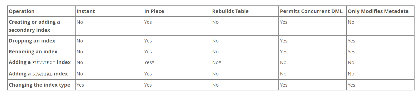 因为DDL有很多种操作,比如创建索引、增加字段、增加外键等,所以不同的操作支持的类型也不一样,具体支持方式可以在mysql官方可以看到(https://dev.mysql.com/doc/refman/5.7/en/innodb-online-ddl-operations.html ),拿索引创建举例: