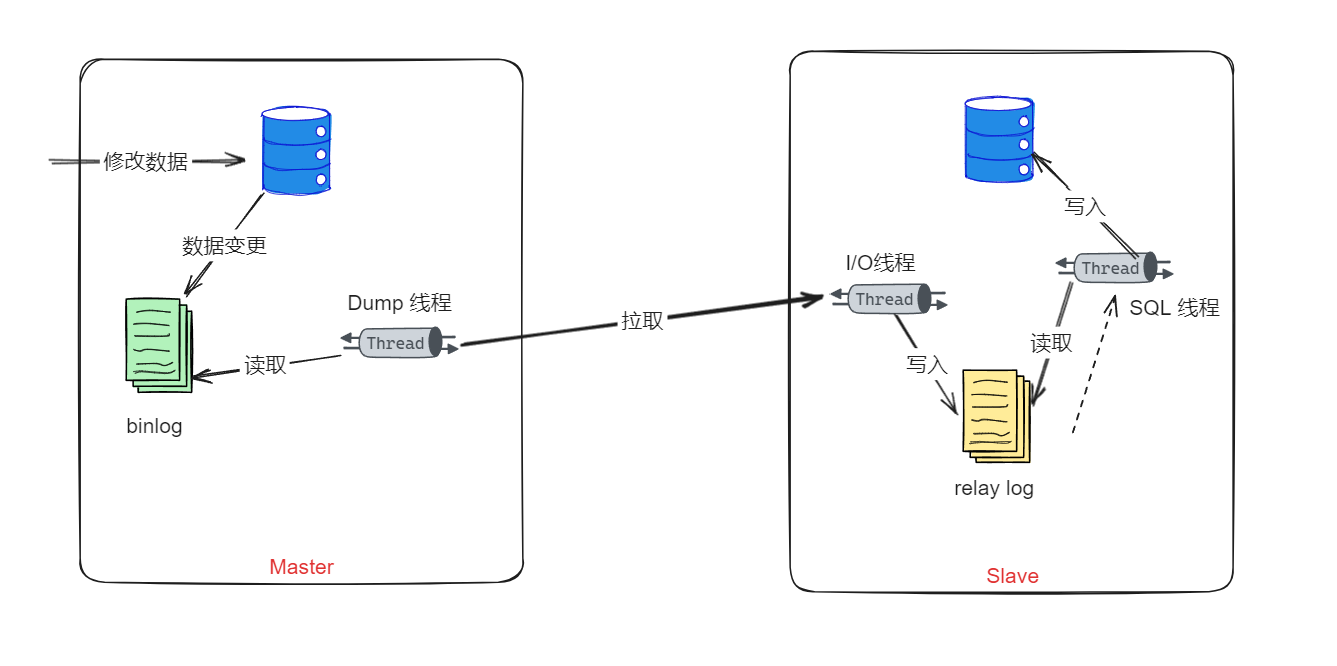 5、在dump线程检测到binlog变化时,会从指定位置开始读取内容,然后会被slave的I/O线程把他拉取过去。