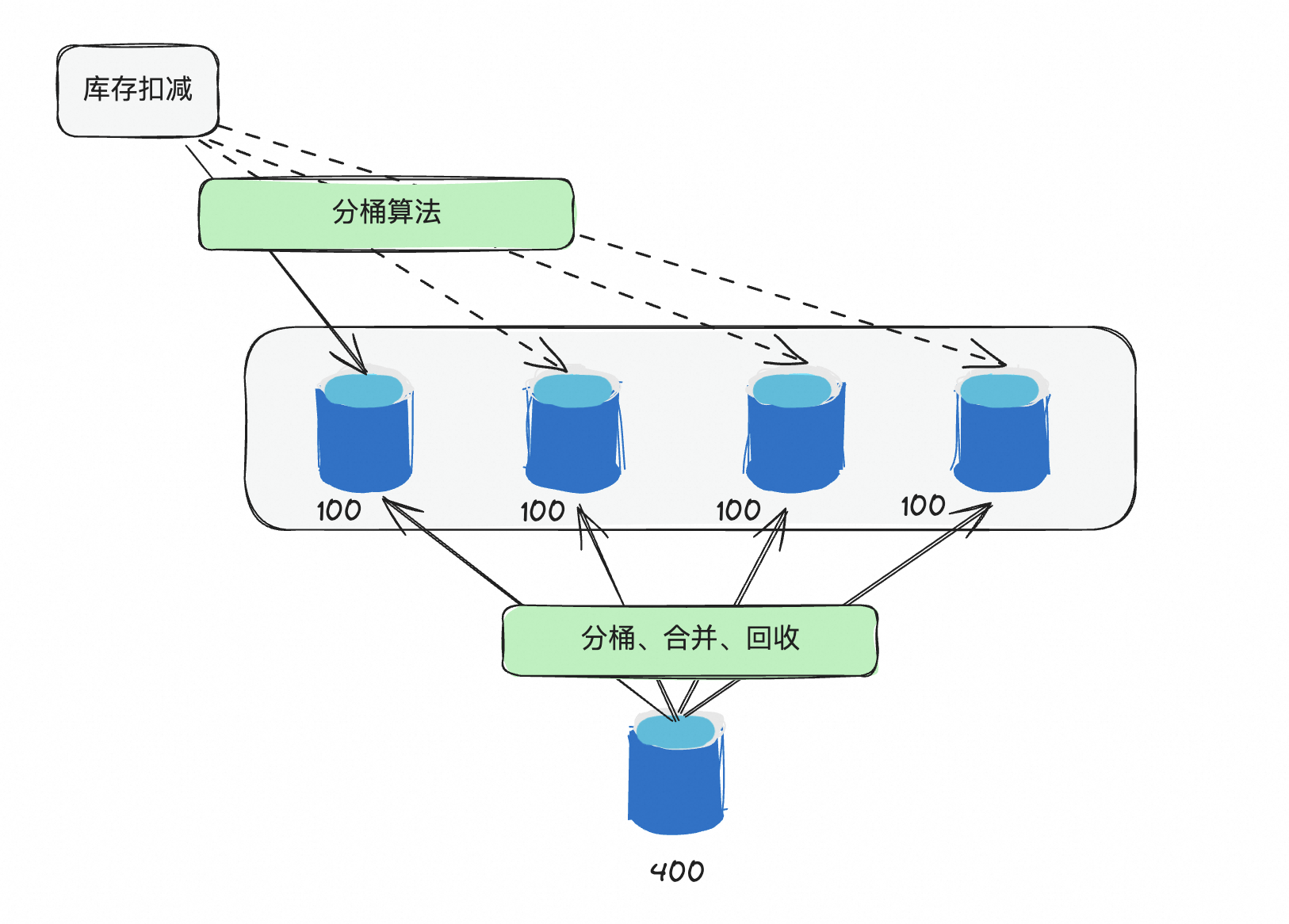 1、库存拆分,把一个大的库存拆分成多个小库存,拆分后,一次扣减动作就可以分散到不同的库、表中进行,降低锁粒度提升并发。